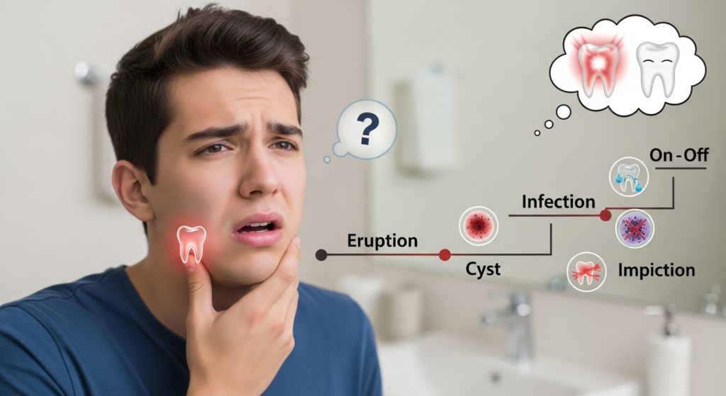 Wisdom tooth pain comes and goes because the underlying causes pressure, inflammation, bacteria, and irritation are not constant. While temporary relief may feel reassuring, recurring pain is your body’s way of signaling that something isn’t quite right.